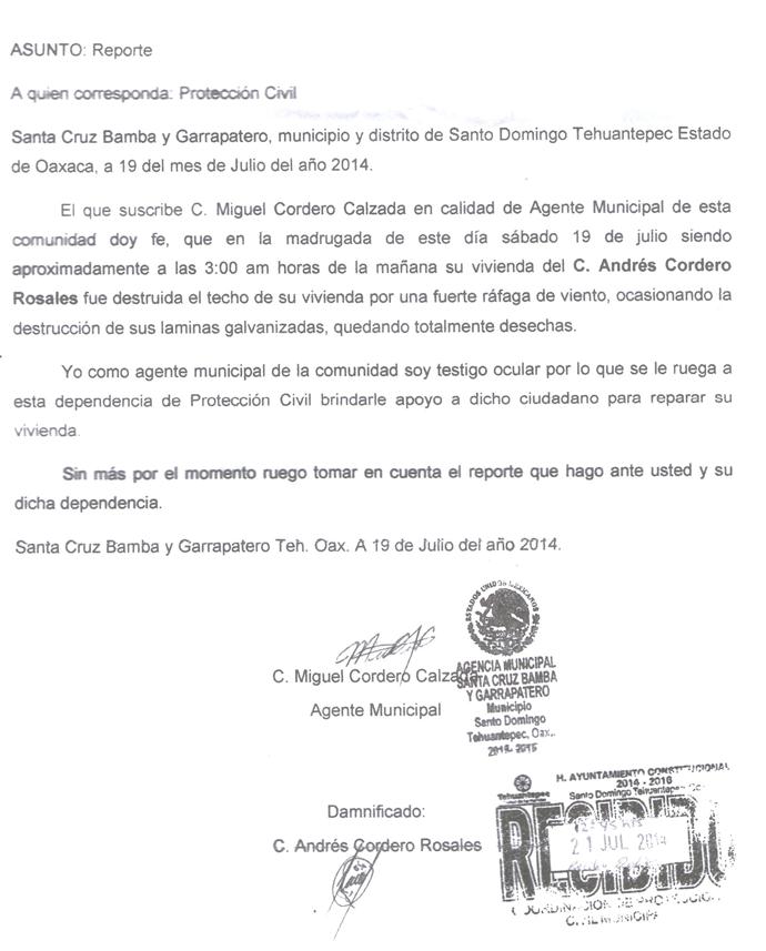 Por su parte el ingeniero Víctor Hernández Marcial, Secretario municipal entrevistado telefónicamente con relación a esta denuncia, aseguró que el caso antes mencionado se le sigue dando seguimiento por lo que en próximas fechas podría darle solución debido a que protección civil estatal aseguró que no fue posible darle apoyos debido a que solo fue una vivienda la afectada.