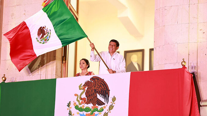 “Oaxaqueñas y oaxaqueños… ¡Vivan los héroes que nos dieron patria y libertad!, ¡Viva Hidalgo!, ¡Viva Morelos!, ¡Viva Josefa Ortiz de Domínguez!, ¡Viva Allende!, ¡Viva Aldama!, ¡Viva la Cuarta Transformación!, ¡Viva el Segundo Piso de la Cuarta Transformación!, ¡Viva la Presidenta Claudia Sheinbaum!, ¡Vivan nuestras hermanas y hermanos migrantes!, ¡Viva la Primavera Oaxaqueña!, ¡Viva Oaxaca!, ¡Viva la Independencia Nacional!, ¡Viva México!, fue la arenga que el Gobernante exclamó.