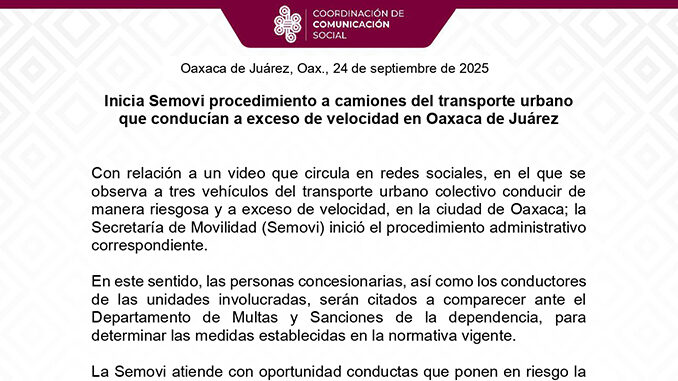 Con relación a un video que circula en redes sociales, en el que se observa a tres vehículos del transporte urbano colectivo conducir de manera riesgosa y a exceso de velocidad, en la ciudad de Oaxaca; la Secretaría de Movilidad (Semovi) inició el procedimiento administrativo correspondiente.