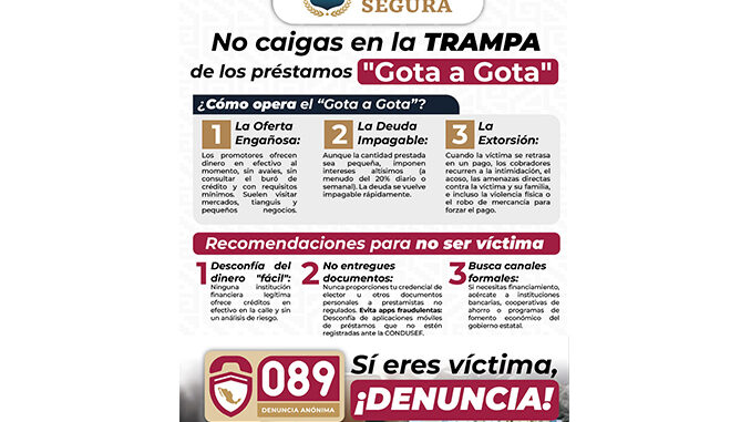 Se exhorta a la población que, en caso de ser o haber sido víctima de este esquema, o si detectan a personas ofreciendo este tipo de «préstamos» en las colonias y entornos regulares: reportar de inmediato a la Línea de Emergencias 9-1-1, utilizar el número 089 para denuncias anónimas y no dejarse intimidar ni realizar más pagos.