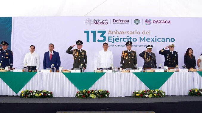 En este marco solemne realizado en la 28 Zona Militar, el Mandatario oaxaqueño resaltó el trabajo permanente de esta institución al servicio de la patria, con un despliegue en el país de más de 150 mil mujeres y hombres, que en conjunto defienden la soberanía de la nación.